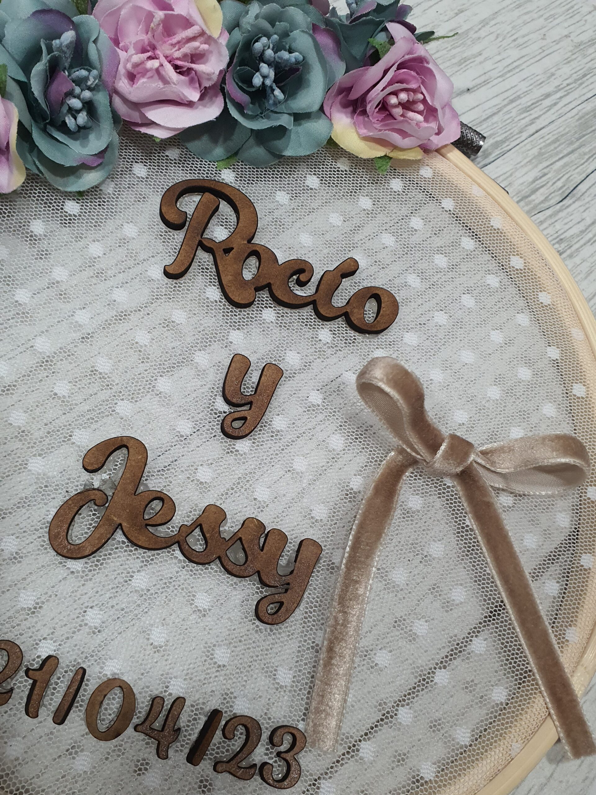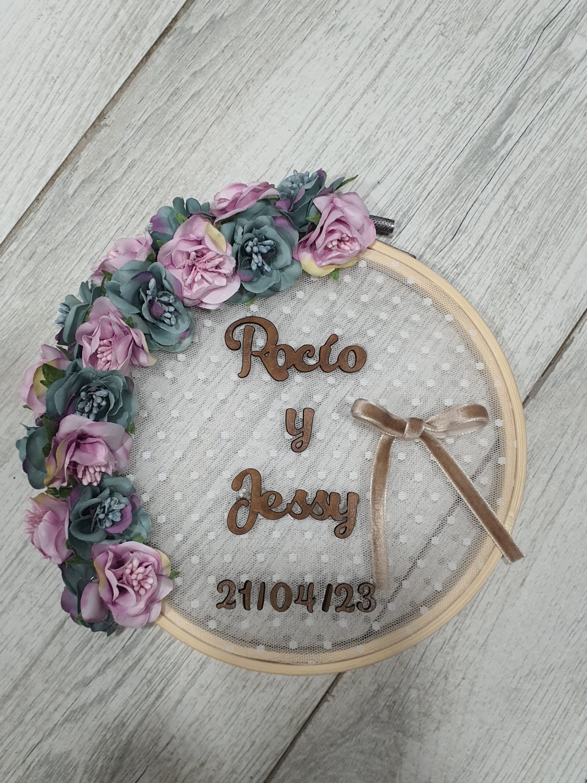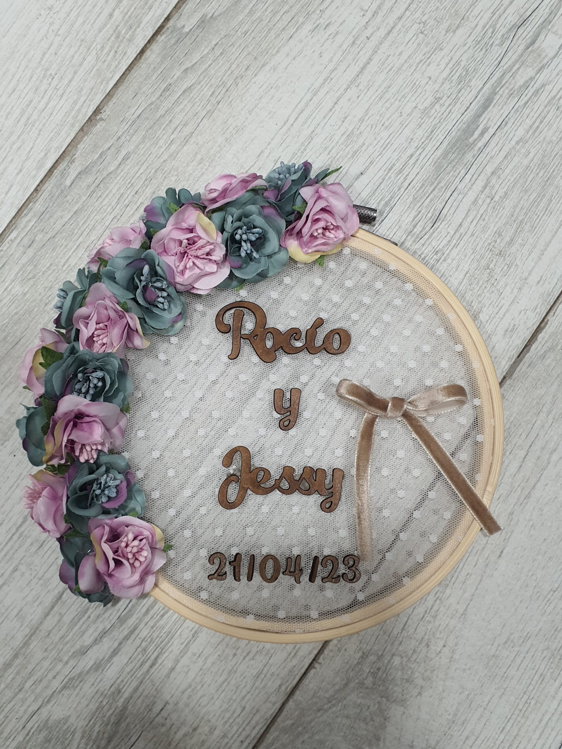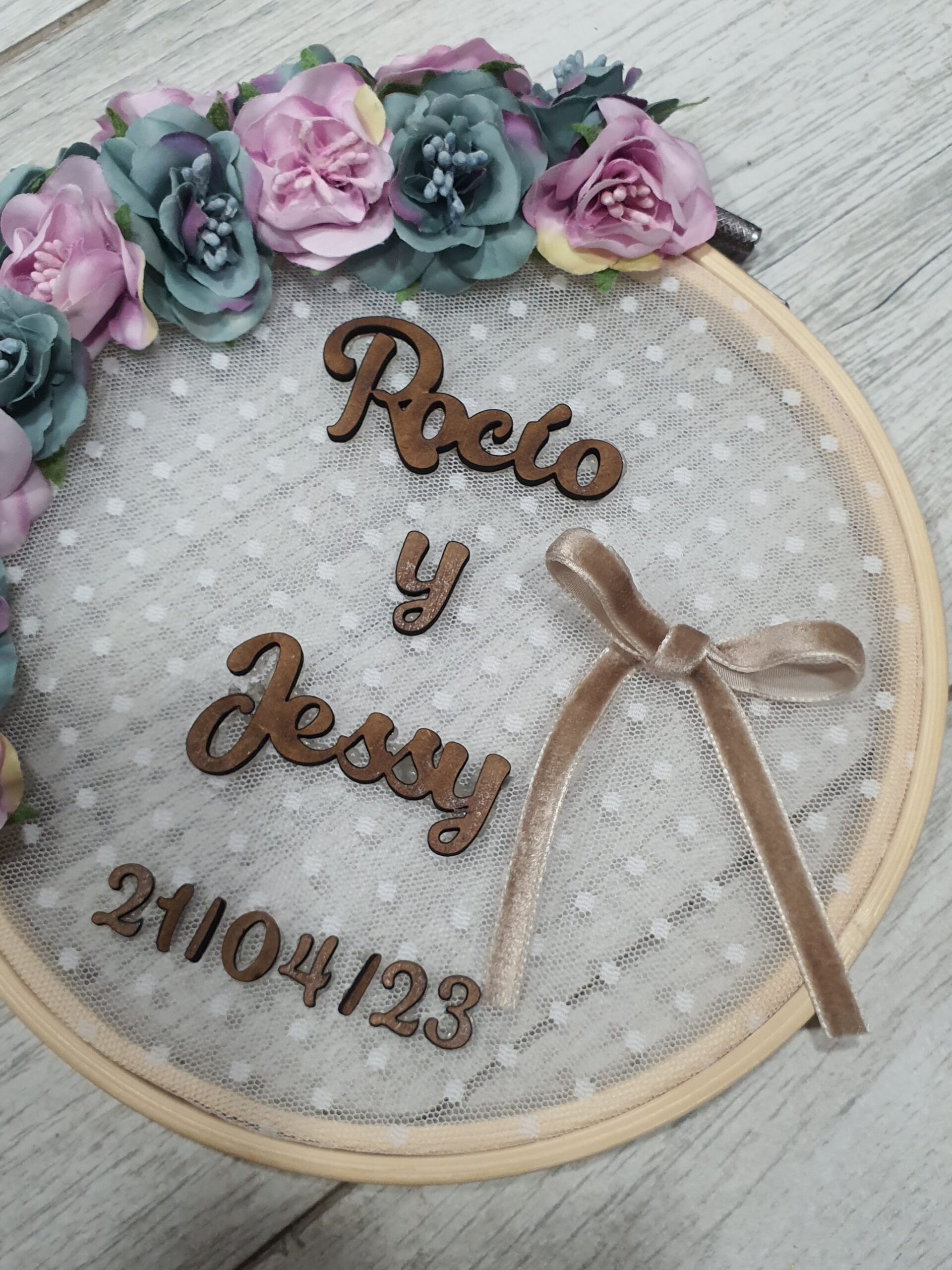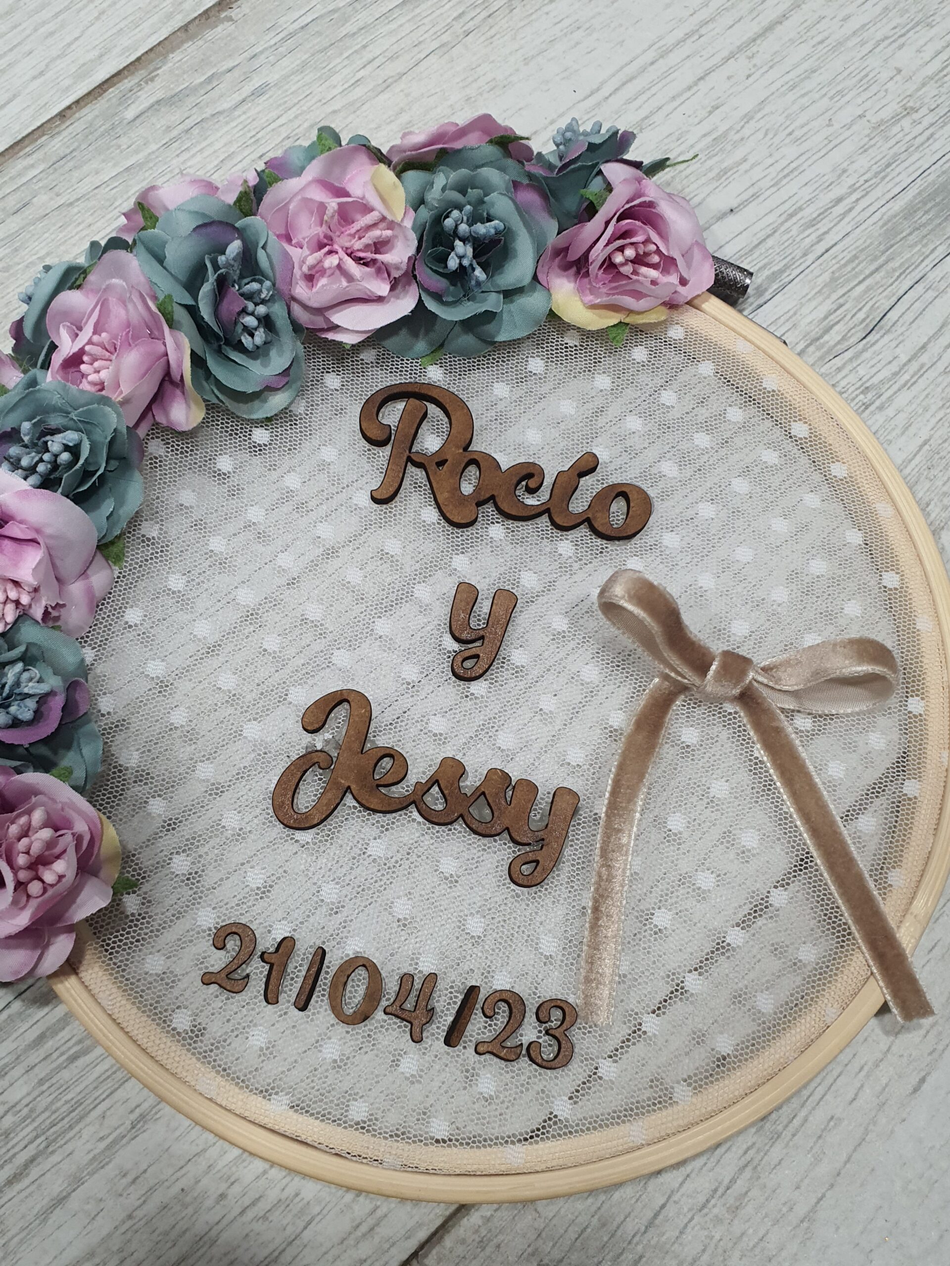 Bastidor de madera de 18cm para las alianzas, decorado con flores del color que quiera, nombres y fecha.