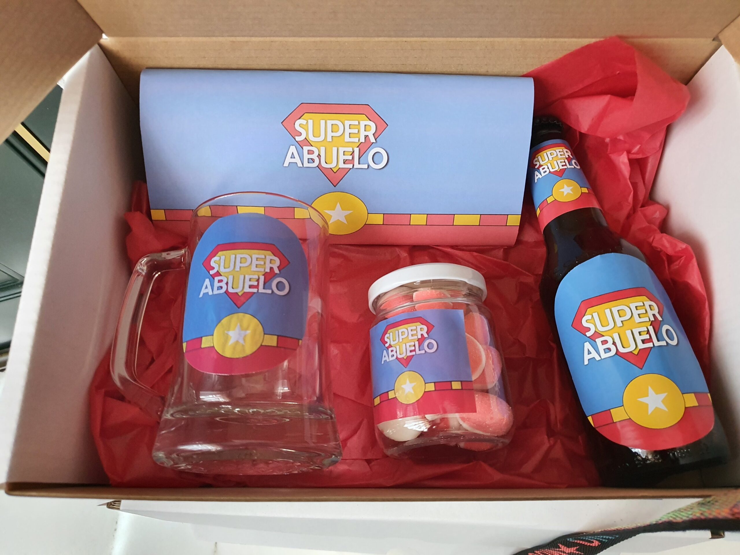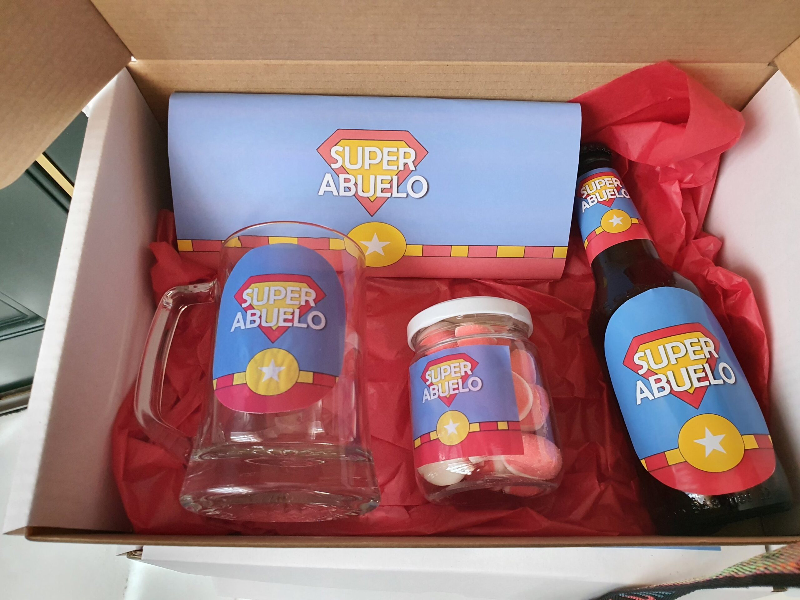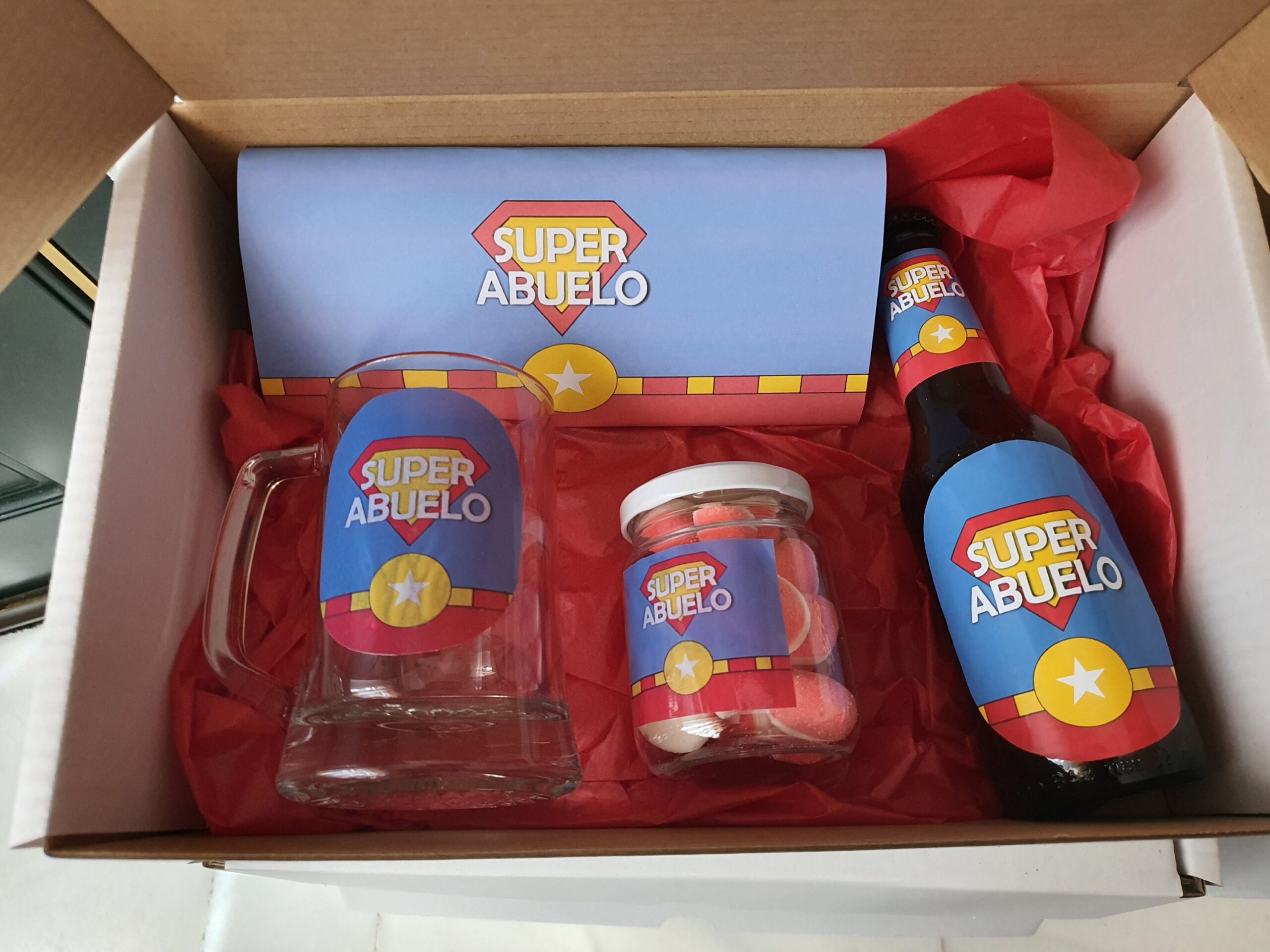 Caja dia del padre, contiene una jarra de cerveza, una cerveza, un bote con chuches y una tableta de chocolate con leche Nestlé.