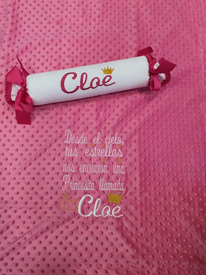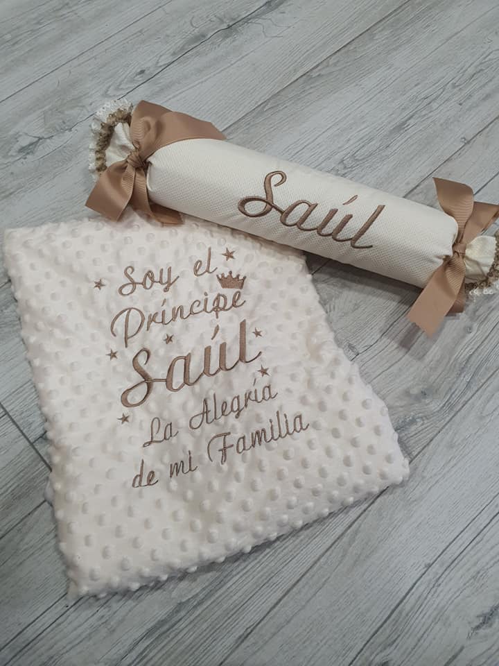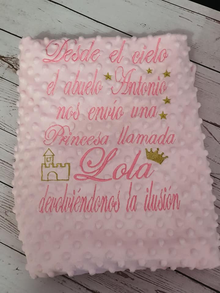 Manta con frase personalizada, escribe en notas la frase que quieres poner con el nombre,color de manta y color de hilo.